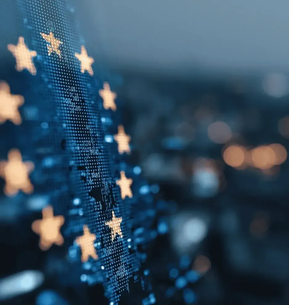 • Nahaufnahme eines digitalen Bildes mit Europa-Fahnen und Sternen in Blau- und Goldfarben.