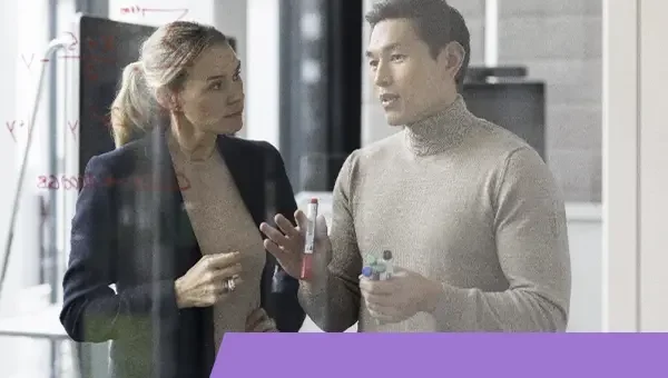 • Zwei Menschen in einem Büro bei einem Gespräch, eine Frau spricht, ein Mann hört zu, im Hintergrund Fenster mit Stadtansicht.