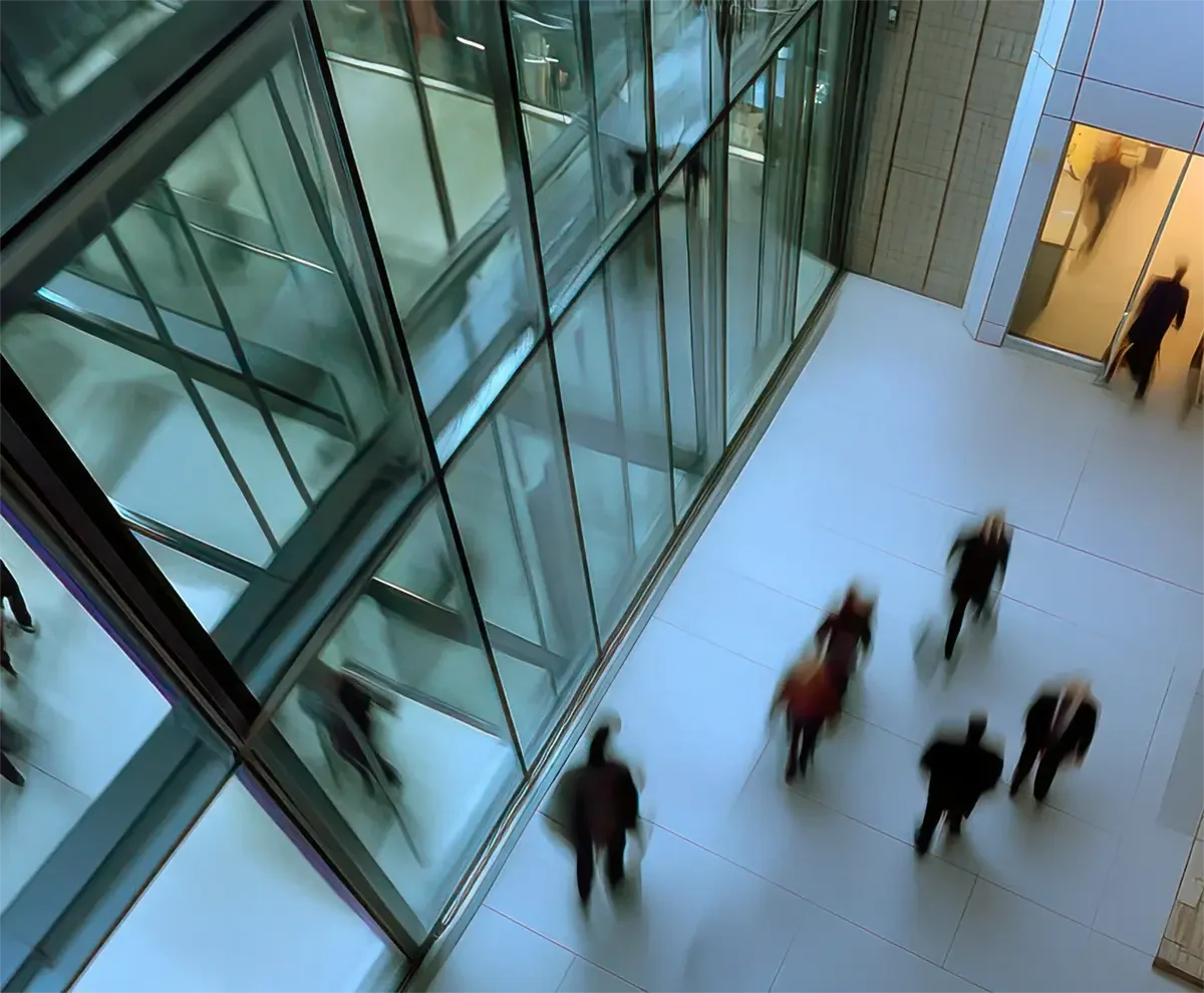• Eine lächelnde Frau mit Headset in einem modernen Büro, die sich an einer Glasscheibe lehnt.